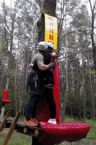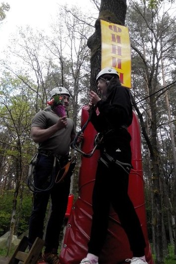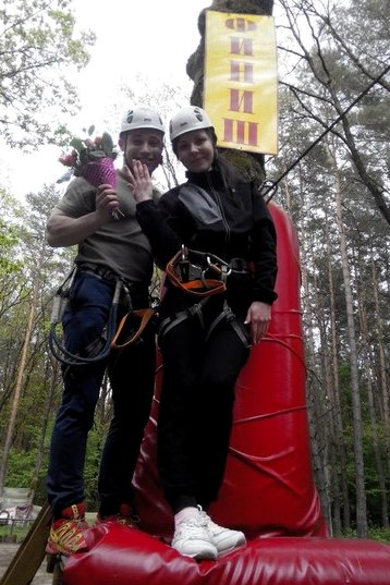 Парень пригласил девушку в «Джунгли Парк», где они вдвоем начали прохождение «Семейной трассы». Пара достаточно быстро  и очень слаженно преодолела все препятствия, Алексей помогал Екатерине пройти наиболее сложные этапы, ребята активно подбадривали друг друга. И вот он – финальный спуск. Парень спустился первым, а на финише его уже ждал наш инструктор. Он передал  Алексею заранее подготовленный букет цветов и … маленькую коробочку с кольцом. Когда спустилась Екатерина, парень задал заветный вопрос. Девушка поначалу растерялась, но потом совладала с нахлынувшими эмоциями и дала положительный ответ.